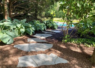 Behind the pool, we added new bluestone steppingstones under the existing Pines and Spruces for a “park-like” walkway that leads you to the pool equipment. While the destination may not seem spectacular, the journey most certainly is. Transplanting existing Hosta throughout the pathway added the final element to complete this stunning new walkway.